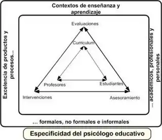 Lo que determina la especificidad del psicólogo educativo, frente al resto de colegas psicólogos y a otros especialistas, viene constituido por un triángulo académico en cuyos vértices aparecen tres categorías: profesores, alumnos y currículos (ver gráfico). En los tres casos, el plural significa que se asume tanto su sentido estricto (concepción oficial clásica) como el más general (el propio de una sociedad de la información y del conocimiento como la actual). Además, el plural también nos indica que en nuestros días ya no se considera sin más al alumno o al profesor promedio o al currículo cerrado, cuanto la enorme variabilidad dentro del profesorado, del alumnado y de los currículos. El triángulo une sus ángulos mediante flechas bidireccionales, lo que nos indica que se están considerando ya cuádruples tipologías frente a los tradicionales binomios (profesor/alumno). Así, nos encontramos, en los diversos ámbitos educativos, con grupos de buenos profesores y alumnos (excelente enseñanza/aprendizaje); grupos de buenos profesores pero malos alumnos y grupos de malos profesores y buenos alumnos (en ambos casos, grados medios en los procesos/productos de enseñanza/aprendizaje); y grupos de malos profesores y alumnos (fracaso general en los procesos/productos de enseñanza-aprendizaje).