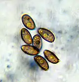 La huella de las esporas es de color marrón violáceo.[10] Al microscopio, las esporas tienen un aspecto marrón púrpura apagado. Son de forma elipsoide a algo ovalada y, según la descripción original de Singer, miden 8-10 por 4-5 μm. Un estudio posterior de especímenes recogidos en la Columbia Británica, Canadá, informó en cambio de un rango de tamaño de esporas mayor, de 10-13 por 6-7 μm. Las esporas tienen un poro germinal apical. Los basidios (células portadoras de esporas) tienen cuatro esporas, son hialinos (translúcidos) y miden 22-35 por 7-10 μm. Hay abundantes cistidios que forman una banda estéril en los bordes de las branquias (queilocistidios); estos cistidios son lisos, inflados y fusoides-ventricos (agrandados en el centro y afilados hacia ambos extremos) con una punta afilada, y miden 25-30 por 6-9 μm. La cutícula del sombrero (un ixocutis) está formada por una capa de hifas hialinas aproximadamente horizontales, gelatinizadas y onduladas, de 0,8-5,5 μm de diámetro.