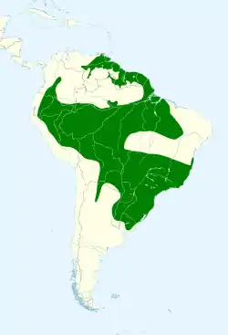 Se encuentran en gran parte de América del Sur, incluida Trinidad en el Caribe, desde el este de Venezuela, Colombia y las Guayanas en el norte a través de Brasil hasta el Argentina y Uruguay en bosques, bosques, sabanas y manglares.[12][13] El límite sur de su distribución se encontraría en Mar Chiquita, en el sureste de la provincia de Buenos Aires, Argentina.[14]