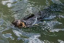 El hocico de esta especie es corto y en conjunto con el resto de la cabeza le confiere a esta un aspecto ovalado.[20] Las orejas son pequeñas y redondeadas.[17] La nariz está complemente cubierta de pelo, a excepción de las narinas. Posee además vibrisas muy sensibles que le permiten detectar cambios en la presión del agua y corrientes, lo que le ayuda a localizar presas.[21] Los miembros son cortos y gruesos, y terminan en grandes pies palmeados con garras afiladas. Poseen membranas interdigitales en sus patas, las cuales utilizan para maniobrar e impulsarse durante el nado lento. Para nadar más rápido se impulsan exclusivamente con la cola. Por el hecho de estar bien adaptada a la vida acuática, puede ocluir las orejas y nariz mientras permanece bajo la superficie.[22][23]