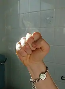 - Esta obra contiene una traducción derivada de «Fist (hand)» de Wikipedia en inglés, publicada por sus editores bajo la Licencia de documentación libre de GNU y la Licencia Creative Commons Atribución-CompartirIgual 3.0 Unported.