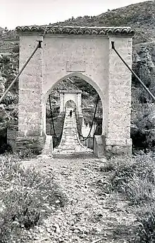 - Puente Colgante. Fue inaugurado en 1894 para servir de paso sobre el río Mijares al Camino Real que atraviesa la villa de Puebla de Arenoso. La fotografía fue tomada en el verano de 1966. A principios del siglo XXI quedó en desuso y se encuentra destruido. Debido a las subidas y bajadas del nivel de agua del pantano de Arenós el terreno sobre el que descansa el pueblo se estaba hundiendo. Por ese motivo la Generalidad Valenciana ordenó las obras de contención del embalse. Para evitar perder parte del patrimonio el ayuntamiento hizo desmontar los restos del puente numerándolos con la intención de reconstruirlo unos kilómetros más arriba.
