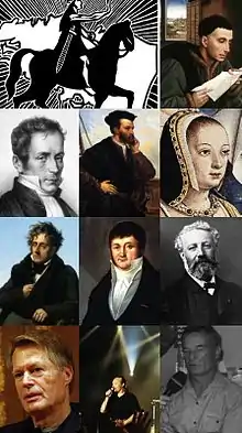 ![]() Primera línea: Nominoe: Primer Duque, Tad ar Vro, St Yves: Erwann, patrón de Bretaña Segunda línea: René Laennec, Jacques Cartier, Anne of Brittany Tercera línea: François-René de Chateaubriand, Robert Surcouf, Jules Verne Cuarta línea: J. M. G. Le Clézio, Alan Stivell, Eric Tabarly | ||