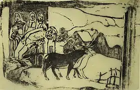 Gauguin murió el 8 de mayo de 1903 en Hiva Oa, en las islas Marquesas. Estaba enfermo, en la miseria, despreciado por los colonos europeos, enfrentado con los misioneros católicos, el gobernador y el gendarme, y condenado por la justicia por enfrentamiento con la autoridad. El 20 de julio se hizo en la isla una primera subasta judicial de los objetos útiles para pagar a los acreedores.[2]El resto se envió a bordo de La Durance hacia Tahití. El escritor Victor Segalen era el médico adscrito al barco y que recogió el testimonio de los últimos días de Gauguin. Además de un centenar de cartas y trece libretas o manuscritos, se recogieron diez cuadros, algunos todavía puestos en el caballete, como el Pueblo bretón bajo la nieve. El 2 de septiembre tuvo lugar la subasta en Papeete, bajo un ambiente de desdén por el artista polémico. Los europeos de Tahití compraron sobre todo los objetos domésticos, y Segalen compró todo lo que pudo de los objetos artísticos: siete de las diez telas, cuatro planchas de madera grabada, la paleta , varias libretas con numerosos dibujos y pruebas de xilografías y monotipos, en total 188,95 francos.[3]
