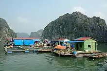 Algunos pueblos pesqueros se disponen sobre las mismas aguas, como los de la bahía Ha Long (Vietnam) o los palafitos (stilt houses) de Tai O[9] construidos en zonas mareales (Hong Kong),[10] y los kelong de Malasia, Filipinas e Indonesia.[11] (India) o los poblados de los urus en el lago Titicaca (Perú y Bolivia).
