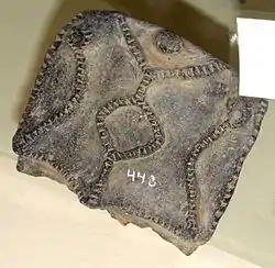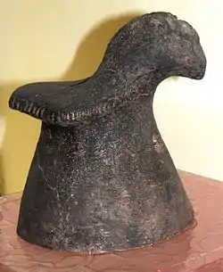 Pieza arqueológica correspondiente a un gran apéndice caudal de una campana, hecha en cerámica, de la etnia timbú, expuesta en el museo municipal profesor Lucas Roselli, de la ciudad de Nueva Palmira, departamento de Colonia, Uruguay.