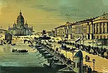 El Puente Azul cruza el río Moika y se encuentra frente al Palacio Mariinski en la Plaza de San Isaac, en pleno centro histórico de la ciudad. El primer puente de hierro fundido en esta ubicación fue diseñado en 1805 por el arquitecto William Heste,[1] y construido en 1818. Era un puente de un solo vano apoyado sobre soportes de piedra, y tenía una anchura de 41 metros. Entre 1842 y 1844, este puente fue ensanchado en su lado norte a su anchura actual de 97.3 metros, la misma anchura que la adyacente Plaza de San Isaac. Poco después de que se ensanchara el puente, había rumores de que la nueva anchura del puente era de 99.9 metros en lugar de los 97.3 reales, rumor del que incluso se hicieron eco algunos libros y folletos oficiales. Actualmente, la mayor parte del Puente Azul sirve como aparcamiento.