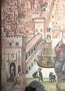 En realidad, el nuevo puente fue construido en 1351 sobre las ruinas del puente romano, siguiendo el proyecto de Giovanni da Ferrara y Jacopo da Cozzo[3]. El puente se completó en 1354: estaba cubierto y tenía diez arcos irregulares y dos torres en sus extremos, utilizadas para la defensa[4]. El aspecto de este puente, aunque con sólo seis arcos, se puede observar en los frescos de Bernardino Lanzani (alrededor de 1524) en la iglesia de San Teodoro. Durante la construcción de las murallas españolas, en el siglo XVII, el primer arco y medio del lado de la ciudad y el primer arco del lado del Borgo se incorporaron a los baluartes y por tanto se cerraron. Posteriormente, se añadieron nuevos elementos: un pórtico de entrada del lado de Borgo Ticino (1599), una capilla en el centro del puente en honor a San Juan Nepomuceno (1746[5] ) y, por último, un pórtico de entrada, construido por Carlo Armati (1822[6]), del lado del centro histórico. En la oficina de registro del Palacio Mezzabarba, sede del municipio de Pavía, se exhibe una maqueta en madera del puente del siglo XIV, construido en 1938. Los bombardeos aliados en septiembre de 1944 durante la Segunda Guerra Mundial dañaron el antiguo puente y destruyeron uno de sus arcos. Al final de la guerra, se abrió un debate sobre la oportunidad de arreglar el viejo puente o derribarlo. Debido al temor de que cualquier derrumbe del puente pudiera haber causado una inundación, en febrero de 1948 el Ministerio de Obras Públicas ordenó la demolición del antiguo artefacto[7].