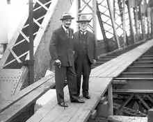 El puente tiene solo un apoyo en la orilla norte, y dos apoyos en la orilla sur, uno para soportar el peso de la celosía (la pila principal) y, más al sur, el segundo apoyo para evitar la torsión del puente (una pila de anclaje). No había necesidad de otro apoyo de anclaje en la ribera norte, ya que el puente estaba fijado a un sólido acantilado de esquisto. El principal desafío al construir el puente fueron los cimientos del lado sur, que debieron ubicarse 40 m por debajo del nivel del suelo. No era posible excavar a cielo abierto a esa cota, ya que el agua se filtraría rápidamente. Por lo tanto, se tuvo que usar la técnica del cajón neumático. Como los hombres trabajaban bajo presiones de hasta 4 veces la presión de aire normal, se necesitaba un período de descompresión de casi 2 horas al final de cada turno para evitar el síndrome de descompresión. Una enfermería dispuesta junto a la obra trató con éxito los 65 casos relativos a problemas de descompresión registrados.[6] El 28 de octubre de 1939 se cerró el vano entre los dos lados del puente.[5] Posteriormente se colocó una plataforma de hormigón, cubierta por una capa asfáltica. El puente fue pintado y se instaló iluminación de sodio. Los accesos al puente también quedaron listos.[6]