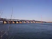El puente tiene una longitud aproximada de 3 kilómetros (1,9 mi) e incluye 24 pilares para romper el hielo.