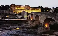 El Puente Viejo sobre el río Cardener a la entrada suroeste de Manresa. El puente ha sufrido varias destrucciones. De origen romano, la actual se trata de la reconstrucción fiel de un puente medieval también reconstruido en el siglo XII, del que sólo se conservan las bases del arco central. El puente, que fue destruido en 1939 y reconstruido entre los años 1960 y 1962, dibuja ocho arcos de medio punto con una altura máxima de 25 m sobre el caudal del río.[2]