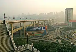 La obra completa, de 4 km de largo, consta de un puente principal, de dos viaductos de acceso (norte y sur), de los intercambiadores de Caiyuanba y de Sujiaba, del túnel de Nancheng, etc. El puente principal es una estructura compuesta formada por una viga en celosía de acero, por un puente en viga cajón de acero y por un puente de arco atirantado.[1]