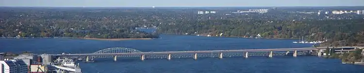 ![]() Dibujo de O. A. Mankell, en 1871, del primer puente de Lidingö. Vista desde Larsberg, en Lidingö. | ||