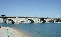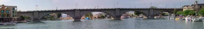 El puente de Londres es una estructura situada actualmente en Lake Havasu City, Arizona, Estados Unidos. Con 280 metros de largo,[3] este puente en arco fue inaugurado originalmente en 1831 y anteriormente se extendía sobre el río Támesis en Londres, Inglaterra, Reino Unido. En 1968, Robert P. McCulloch compró el puente a la alcaldía de Londres. McCulloch hizo cortar los bloques de granito exteriores del puente original y transportarlos a los Estados Unidos para usarlos en la construcción de un nuevo puente en Lake Havasu City, una comunidad planificada que se estableció en 1964 en la orilla del lago Havasu. El puente se completó en 1971 (junto con un canal) y une una isla en el río Colorado con la parte principal de Lake Havasu City. Es una estructura de hormigón armado revestida con la mampostería original del puente de la década de 1830.