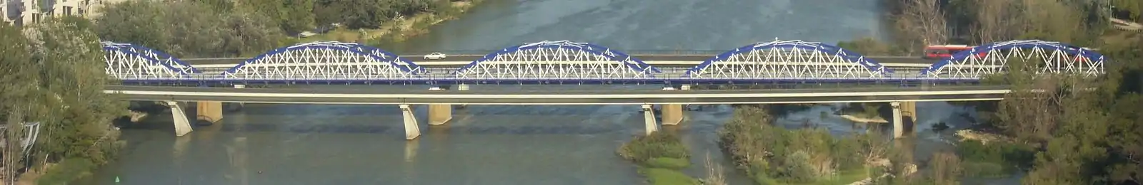"Su trabajo [de Antonio Fernández de Navarrete Hurtado de Mendoza] más importante estuvo vinculado a la construcción del Puente de Nuestra Señora del Pilar (popularmente conocido como Puente de Hierro) sobre el Ebro en la ciudad de Zaragoza. Él fue el encargado de los primeros diseños para su construcción. A partir de 1884 elaboró distintos estudios que debieron ser repetidamente modificados a fin de ajustarlos en características técnicas y coste de la obra. Dirigió la construcción del puente entre 1887 y 1891."[2]