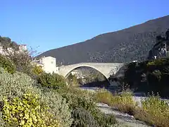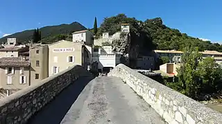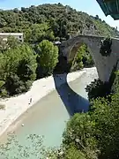 - paso abovedado acondicionado en el estribo izquierdo a 3.50 m sobre el río; «Tienes que pasar por debajo del puente Nyons antes de pasar por encima» («il faut passer sous le pont de Nyons avant de passer dessus»);
