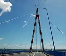 - 72 tirantes (del tipo cables cerrados) en 4 abanicos, fijados a dos pilonas metálicas en V invertida, articulados en el pie, y cuya cabeza está aproximadamente a 130 m sobre el nivel del agua más baja.