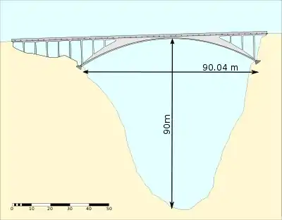 El arco del puente de Salginatobel tiene 133 m de longitud y su elemento principal es una viga cajón hueca de hormigón sobre la parte central del arco.[3] Sobre el puente pasa una carretera de 3,5 m de ancho que descansa sobre pilares de hormigón armado que parten de la zona superior del arco.[3]