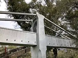 Para el paso se diseña una estructura de 14 pilas,[4] con luces biapoyadas de 30 metros. Dos de estos pilares se asentaban en el cauce, por lo que se dudó que la estructura pudiera resistir los embates del río en caso de inundación. Es por ello que Eduardo Torroja, el encargado de diseñar de la obra decide sustituir los dos pilares por un vano central con dos ménsulas de 20 metros y un tramo central de 17 metros. Para soportar las ménsulas se extienden tirantes de acero de 63 mm de diámetro que se apoyan sobre las pilastras. Para tensar el cable se elevó la sección superior de la pilastra con gatos,[5] provocando la reacción vertical necesaria para poner en tensión los tirantes y dejar el puente en carga. El mismo Torroja cuenta que al poco de hormigonar la estructura, el agua empezó a subir en el cauce amenazando la integridad de la estructura. Cuando se consideró que el hormigón había alcanzado la suficiente resistencia se accionaron los gatos, elevando la estructura unos 25 cm y elevando el vano 5 cm. La cimbra finalmente se la llevaría el agua, pero pudo terminarse el puente a tiempo. El puente quedó finalizado en enero de 1927.