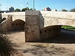 En 1349, coincidiendo con un periodo de fuerte consolidación y caracterización urbana, el Consell General ordenó que el puente fuera construido en piedra para resistir mejor las avenidas del Turia. Las riadas de 1406 y 1427, pero sobre todo la de 1517 infligieron graves daños al puente, por lo que un año después, la Fábrica vieja de muros y fosos dispuso el 22 de junio de 1518 su reedificación tal y como es en la actualidad. Construido en piedra, bajo la dirección del picapedrero Juan Bautista Corbera, posee rampa escalonada de acceso al cauce, actual Jardín del Turia, y está formado por nueve arcos escarzanos con escollera, tajamares y pretiles.[1][2]