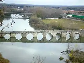 Se trata de un puente romano-medieval de piedra, construido en sillería con 17 arcos (mayoritariamente ojivales) con tajamares y contrapilares. Ocupa un lugar de gran importancia para las comunicaciones terrestres desde la Antigüedad, ya que se encuentra en el antiguo trazado de la calzada romana entre Augusta Emerita y Caesaraugusta. De hecho, hoy en día, forma parte del trazado del camino de Santiago de Madrid.