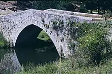La estructura está realizada con sillares de buena factura, aunque el estribo presenta una sillería de diferente época, resultado quizá de diferentes reparaciones. La bóveda del arco tiene dovelas bien construidas, en forma de arco apuntado. Los tímpanos se conservan bastante bien, son de buena sillería, disponiéndose ésta de forma apuntada para acomodarse a la clave del arco; aspecto éste que se prolonga hasta el pretil del puente. Los pretiles son, por tanto, la continuación del propio tímpano, rematados por albardellas semicirculares también de sillería. El tablero es alomado.