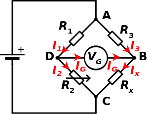 En el esquema de la derecha se tiene Rx, que es la resistencia cuyo valor se quiere determinar; R1, R2 y R3 son resistencias de valores conocidos, además la resistencia R2 es ajustable para fijar el punto de equilibrio. Si la relación de las dos resistencias del brazo conocido (R1/R2) es igual a la relación de las dos del brazo desconocido (R3/Rx), el voltaje entre los puntos D y B será nulo y no circulará corriente a través del galvanómetro VG. En caso de desequilibrio, la dirección de la corriente en el galvanómetro indica si R2 es demasiado alta o demasiado baja. El valor de voltaje de la fuente de alimentación (Vs) es indiferente y no afecta la medición.