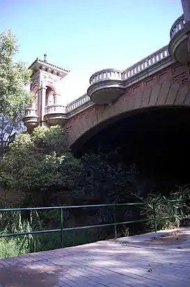 Consta de tres grandes arcadas construidas en hormigón armado, correspondiendo el ojo central al cauce del río y los laterales a dos paseadores que discurrían paralelos por las riberas del río.