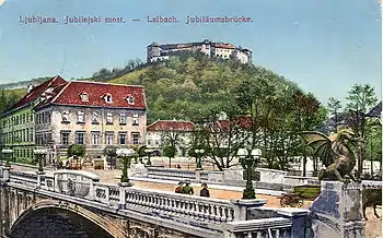 El Puente de los Dragones fue uno de los primeros puentes de hormigón armado en Europa y el primero en la ciudad de Liubliana. Con 33,34 metros de luz tenía el tercer arco más largo entre los puentes europeos de entonces.[5] El nombre oficial del jubileo, cayó pronto en desuso y el puente, por su decoración, llegó a ser conocido como "el puente de los Dragones".