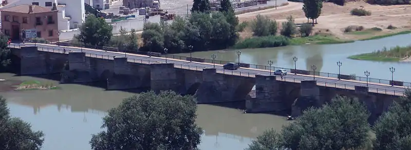 El puente tiene una longitud de 360 m, construido en piedra, y está compuesto por 16 pilas y 17 arcos, todos desiguales. Las 16 pilas tiene tajamares en ángulo aguas arriba y pilastrones rectangulares aguas abajo. Los arcos 1, 2, 3, 4, 7, 9, 13 y 15 son pequeños y ojivales. Los cuatro primeros son probablemente los más antiguos, pues debido a su recogida situación siempre han estado protegidos de las múltiples riadas. El resto de arcos son semicirculares y son el producto de reparaciones posteriores.