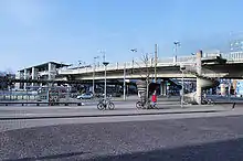 El puente, a la izquierda el área techada donde se encuentran las paradas de tranvía directamente por encima de las vías de ferrocarril; a la derecha, en el trasfondo, el borde del edificio de la estación central