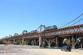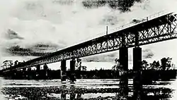![]() Imagen del Puente, junto con una locomotora y la rivera del río Toltén | ||