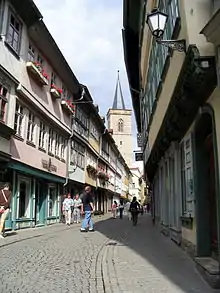 El Krämerbrücke («pont des Épiciers»), en Erfurt, de madera originalmente, fue reconstruido en piedra en 1325 en el amplio brazo del Gera. Después del gran incendio de 1472, la ciudad decidió erigir en el puente 62 casas en las que los comerciantes tuvieran tienda y domicilio.