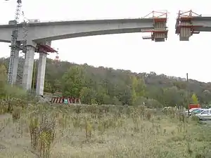 El lanzador de dovelas consiste en una pareja de vigas metálicas de celosía sobre las que se desplaza un pórtico grúa que transporta las dovelas hasta su posición.