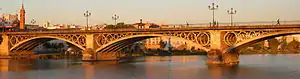 - Puente de Alfonso XIII, construido con motivo de la Exposición Iberoamericana de 1929. Desmontado en 1998, conocido popularmente como el puente de Hierro.