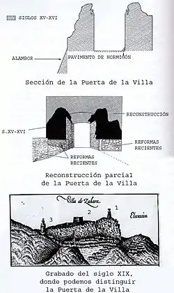 El arco, hoy desaparecido, sería de tipo carpanel(formado por varios arcos de círculo de diferentes centros, su aspecto es de un arco semielíptico)deprimido que no ofrece una cronología concreta aunque pudiera englobarse en ese momento del s.XV.[1] Los dos paramentos laterales aguantarían un cuerpo superior sobre el arco, del que se desconoce su fábrica y altura, aunque es posible que la primera fuera idéntica a la de los paramentos. En el año 1812, los franceses abandonan Zahara y, en su retirada, explosionan la Puerta de la Villa Medieval como nos relata el acta capitular de 1813, a la vez que nos da más detalles de la Puerta de entrada a la villa medieval, permitiéndonos acercarnos un poco más a como fue dicha puerta.