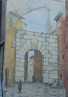 Se encontraba al Norte de la población. Era de un solo arco, sin otro mérito que su antigüedad y se dirigía en línea recta a la calle o plaza del Mercado. Su construcción data del año 1118, en que hizo su entrada por ella Don Alfonso el Batallador. Su verdadero nombre es el de san Ildefonso, aunque vulgarmente se la conoce con el de la Tripería, por hallarse a la cabeza de dicha calle.