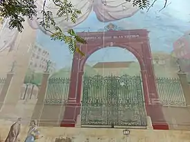 Esta puerta se construyó en treinta días, con motivo de la venida de SS. MM. a esta capital para inaugurarse el día de su llegada conforme al plano que sirvió a la que se construyó en la del Duque, en la plaza de san Miguel.