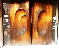 Son unas funcionales puertas de madera de cedro, cuya relativa facilidad para moldear y tallar combina con su resistencia a las inclemencias del tiempo. Interiormente su estructura es muy simple, ya que están basadas en dos varas de acero en la parte baja y superior, que quedan ocultas por la madera. A partir de esta estructura, el autor colocó diversas planchas y les dio la forma prevista. Hay un mecanismo, formado por rodamientos, que permite que estas hojas, de unos 400 quilos de peso, cada una, se desplacen con suavidad y delicadeza, lo cual le confiere a la obra una gran ligereza.[3][4]