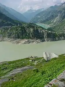 ![]() Vista sobre el lago de Grimsel a la izquierda y el Räterichsbodensee al fondo. | ||