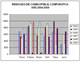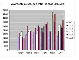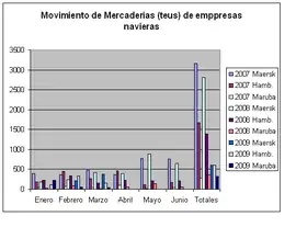 A continuación de presentan gráficos donde se presenta la comparativa entre los meses de enero a junio de los años 2007 y 2008 del tráfico de mercadería de las empresas navieras Maersk, Hamburg Sud y Maruba que operan en este puerto. El gráfico siguiente muestra la variación del transporte de mercadería entre los años 2003 y 2008 y los restantes el movimiento de combustible y de pescado.[16]