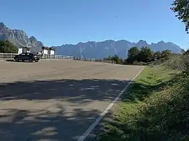 ![]() Carretera LE-2711 a la altura del puerto de Panderrueda. Al fondo, el macizo central de los Picos de Europa | ||