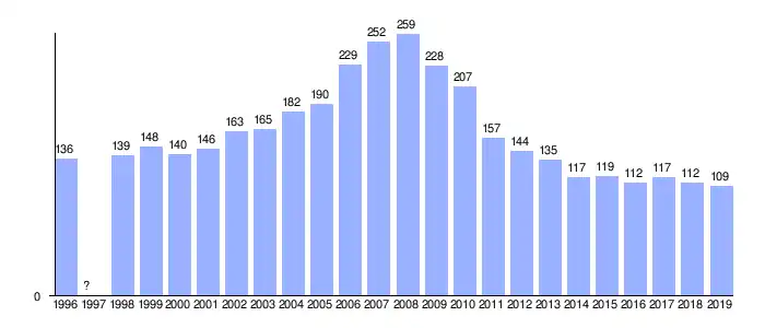Gráfico de la evolución de la población de Puertomingalvo entre 1996 y 2016[8] |