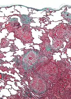 ![]() Micrografía de neumonitis por hipersensibilidad, la histología corresponde a un pulmón de cuidador de aves. Biopsia de pulmón . Tinción tricrómica. | ||