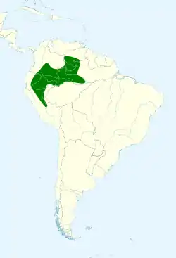 Su hábitat natural son las selvas de Brasil, Colombia, Ecuador, Perú y Venezuela.[1]