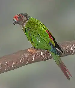 El perico de frente rosada (Pyrrhura roseifrons) también conocido como el perico de corona roja (dando una fácil confusión con el Cyanoramphus novaezelandiae), o en la avicultura, el conure frente rosa, es una especie de loro de la familia Psittacidae. Se encuentra en la cuenca occidental del Amazonas en el oriente de Perú, hasta el sureste de Ecuador, noreste de Bolivia y el extremo oeste de Brasil. Incluye al perico de pecho ondulado (P. roseifrons peruviana), también conocido como el conure de pecho ondulado, que a veces es considerado una especie aparte.