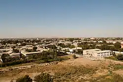 Es en el centro de un fértil oasis que produce trigo, algodón, y seda. El nombre moderno "Qarshi" significa fortaleza.