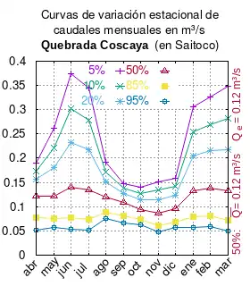 El caudal del río (en un lugar fijo) varía en el tiempo, por lo que existen varias formas de representarlo. Una de ellas son las curvas de variación estacional que, tras largos periodos de mediciones, predicen estadísticamente el caudal mínimo que lleva el río con una probabilidad dada, llamada probabilidad de excedencia. La curva de color rojo ocre (con ) muestra los caudales mensuales con probabilidad de excedencia de un 50%. Esto quiere decir que ese mes se han medido igual cantidad de caudales mayores que caudales menores a esa cantidad. Eso es la mediana (estadística), que se denota Qe, de la serie de caudales de ese mes. La media (estadística) es el promedio matemático de los caudales de ese mes y se denota .