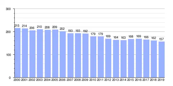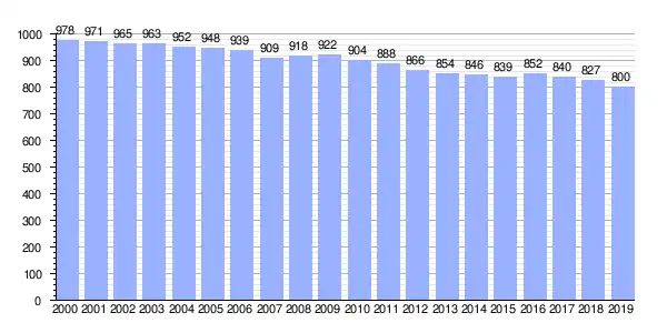 Gráfica de evolución demográfica de Queiruga (parroquia) entre 2000 y 2019 |