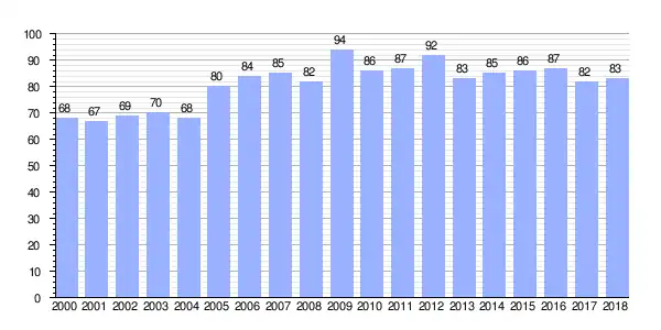 Gráfica de evolución demográfica de Quintáns entre 2000 y 2018 |